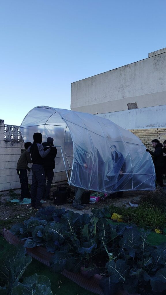 En una mañana fría de enero, los alumnos de FP Básica de Mantenimiento de Vehículos imparables trabajando en equipo. Se propusieron que hoy restauraban el invernadero y lo han conseguido con su profesor Juan José Cobo.